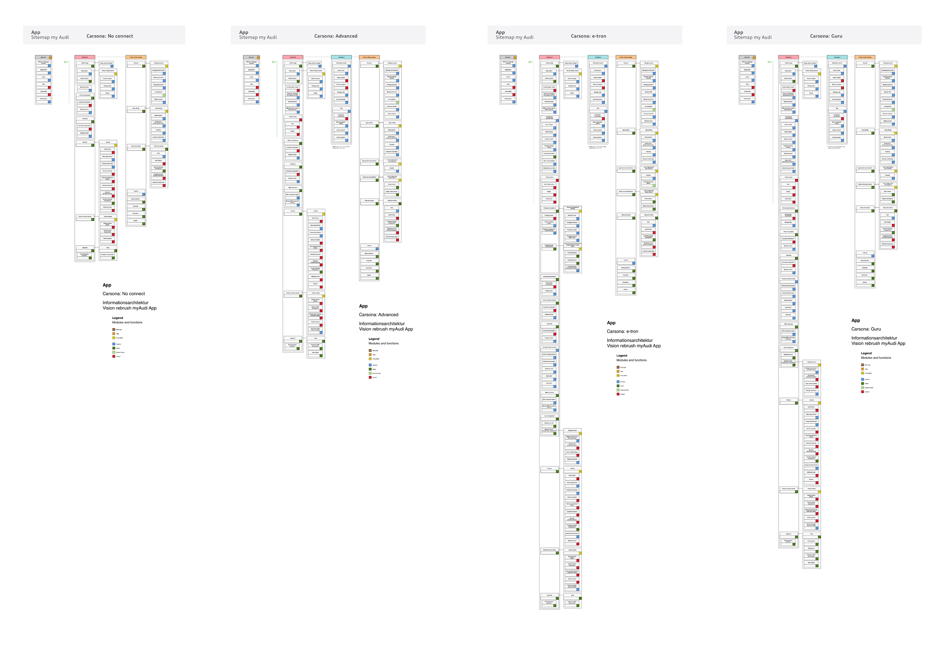 We coined the term 'Carsona' to represent the different vehicle types users can access through the app. Each Carsona has specific functions based on varying drive types and levels of connectivity. The entire vehicle fleet can be categorised into four distinct Carsona groups: Non Connect, Advanced, e-tron and Guru.