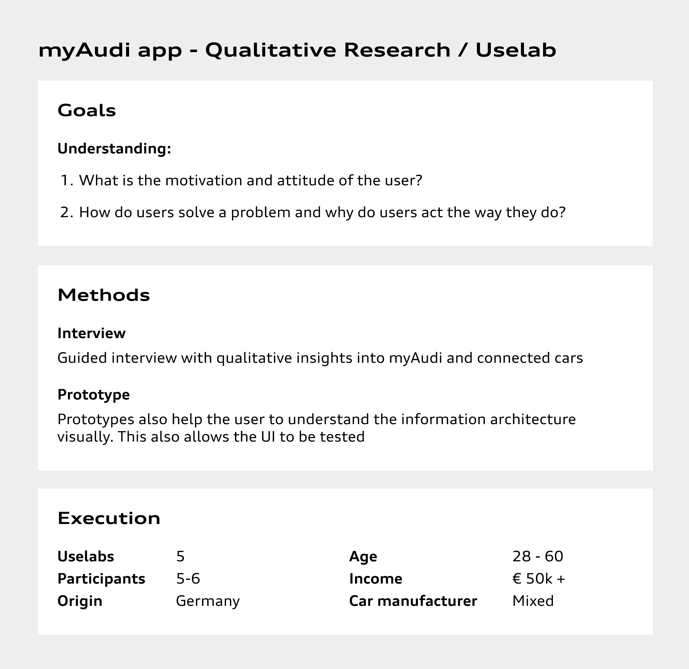 A comprehensive re-design of an Audi mobile application, encompassing everything from information architecture to user interface